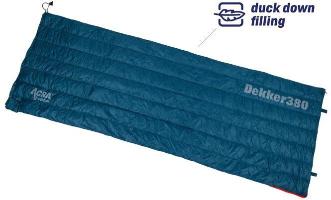 Az Acra Dekker380 ideális választás azoknak, akik ötvözni szeretnék a praktikusságot és a kényelmet. Hálózsákként meleg tollal burkol be, míg kinyitva tágas takaróként használható, amely alá két személy is befér. Tökéletes társ kempingezéshez, lakóautóhoz vagy akár a szabad ég alatti alváshoz.